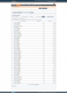 3. Zakładka REFERRING DOMAINS pozwala obejrzeć domeny, z jakich przychodzą linki do bloga. Jednocześnie mamy do wyboru szereg opcji sortujących – na ekranie dla przykładu wybrałem pokazanie ile linków zwrotnych jest do domeny, która linkuje do mojego bloga – to bardzo ciekawe rozwiązanie umożliwiające spojrzenie wgłąb linkowania (drugi poziom).