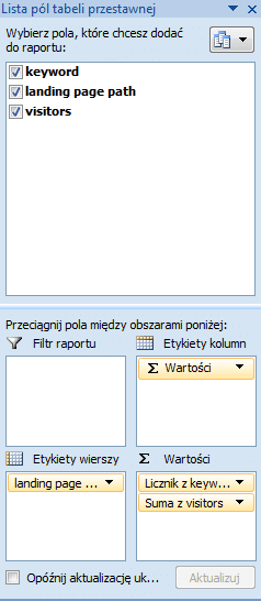 Pojawia się menu, w którym możemy poszczególne kolumny przyporządkować jako Etykiety wierszy lub jako wartości. Nie jest moim celem szczegółowe wyjaśnianie działania tabel przestawnych w Excelu, więc ograniczę się do pokazania zrzutu ekranowego z gotowymi ustawieniami. ?Landing page path? jest w polu ?Etykiety wierszy?, a ?keyword? i ?visitors? w polu ?Wartości?, przy czym dla ?keyword? działa funkcja licznika, która zlicza wystąpienia, a dla ?visitors? funkcja sumy, która sumuje ruch. Są to ustawienia domyślne, więc wystarczy poprzeciągać wszystko w odpowiednie pola: