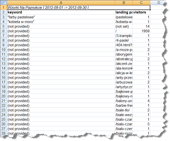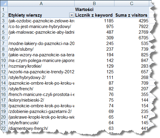 Po pobraniu danych w Excelu mamy długą listę ścieżek, słów kluczowych i liczby wizyt, która wygląda tak: