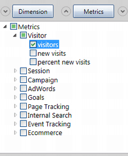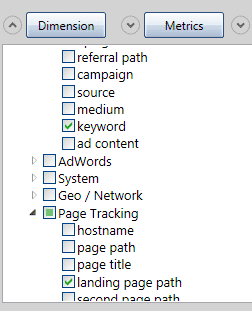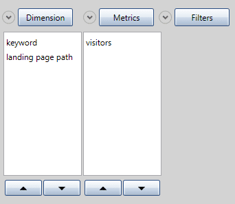 Potrzebujemy z GA pobrać dwa wymiary (Dimensions): słowo kluczowe (keyword) i stronę docelową (landing page path) i jedną metrykę (Metrics): liczbę wizyt (visitors). W tym celu rozwijamy menu dostępne dostępne pod przyciskami Dimensions i Metrics i zaznaczamy opcje jak poniżej: