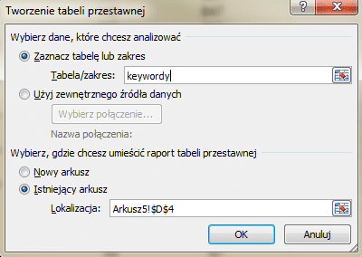 W tym momencie mamy już wszystkie dane do przygotowania tabeli przestawnej. Warto sobie na jej potrzeby przygotować nowy arkusz. Następnie z karty Wstawianie na wstędze menu wybieramy ?Tabela przestawna? i w polu tabela/zakres podajemy wpisaną wcześniej nazwę naszego zakresu (keywordy).