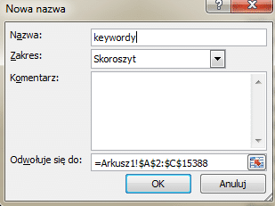 Zaznaczamy całą tabelę, klikamy na zaznaczeniu prawym klawiszem myszy i wybieramy opcję ?Nazwij zakres?. Nadajemy nazwę i zatwierdzamy. W moim przypadku nazwałem ten zakres ?keywordy?.