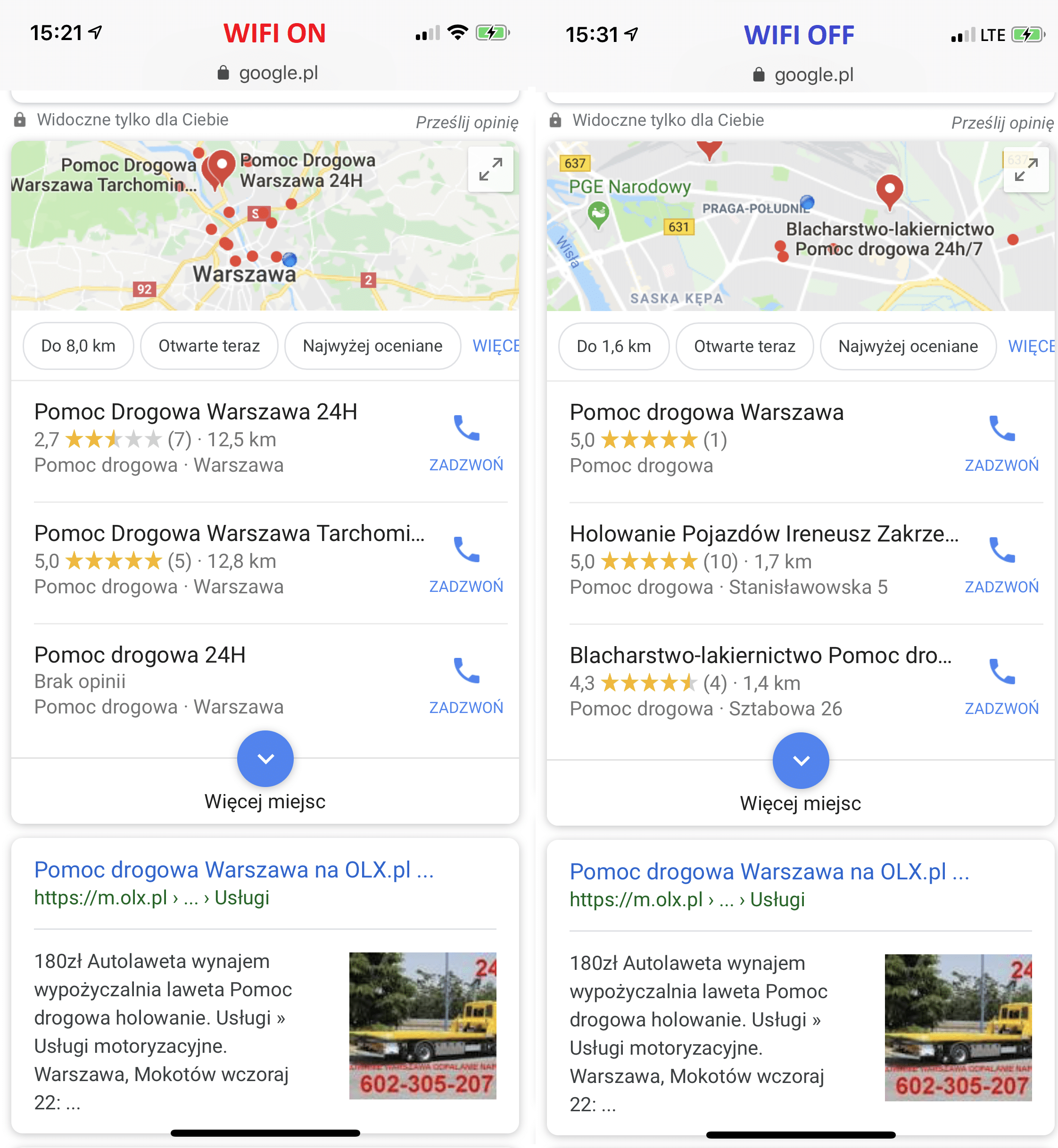 Poniżej przykład dla frazy: pomoc drogowa – dwa razy odpytane (z włączonym WIFI oraz bez) a jakże inne wyniki.