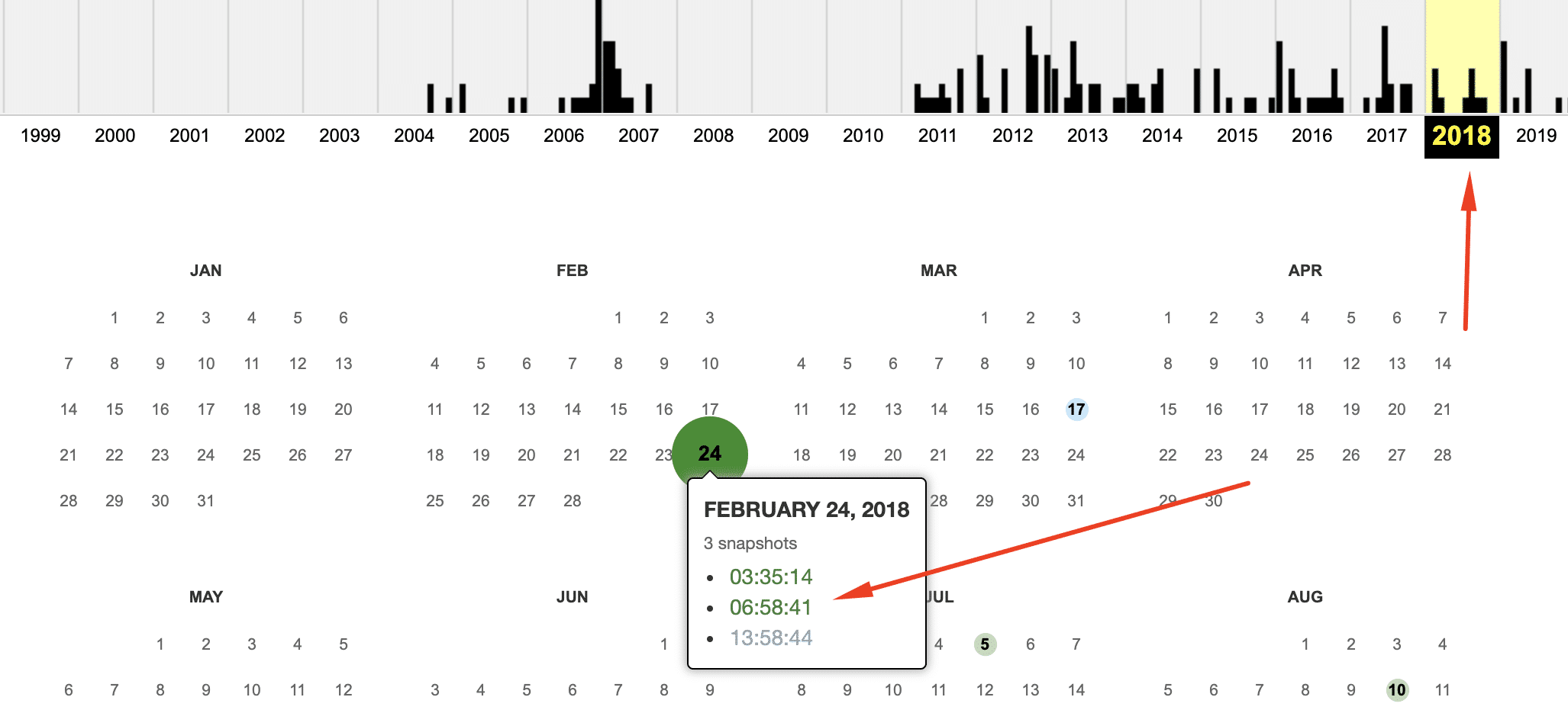 Na powyższym przykładzie wybrałem rok 2018, luty. Zielone daty oznaczają przekierowanie 3xx (czyli serwis Wayback znalazł zapewne 301 labo 302).