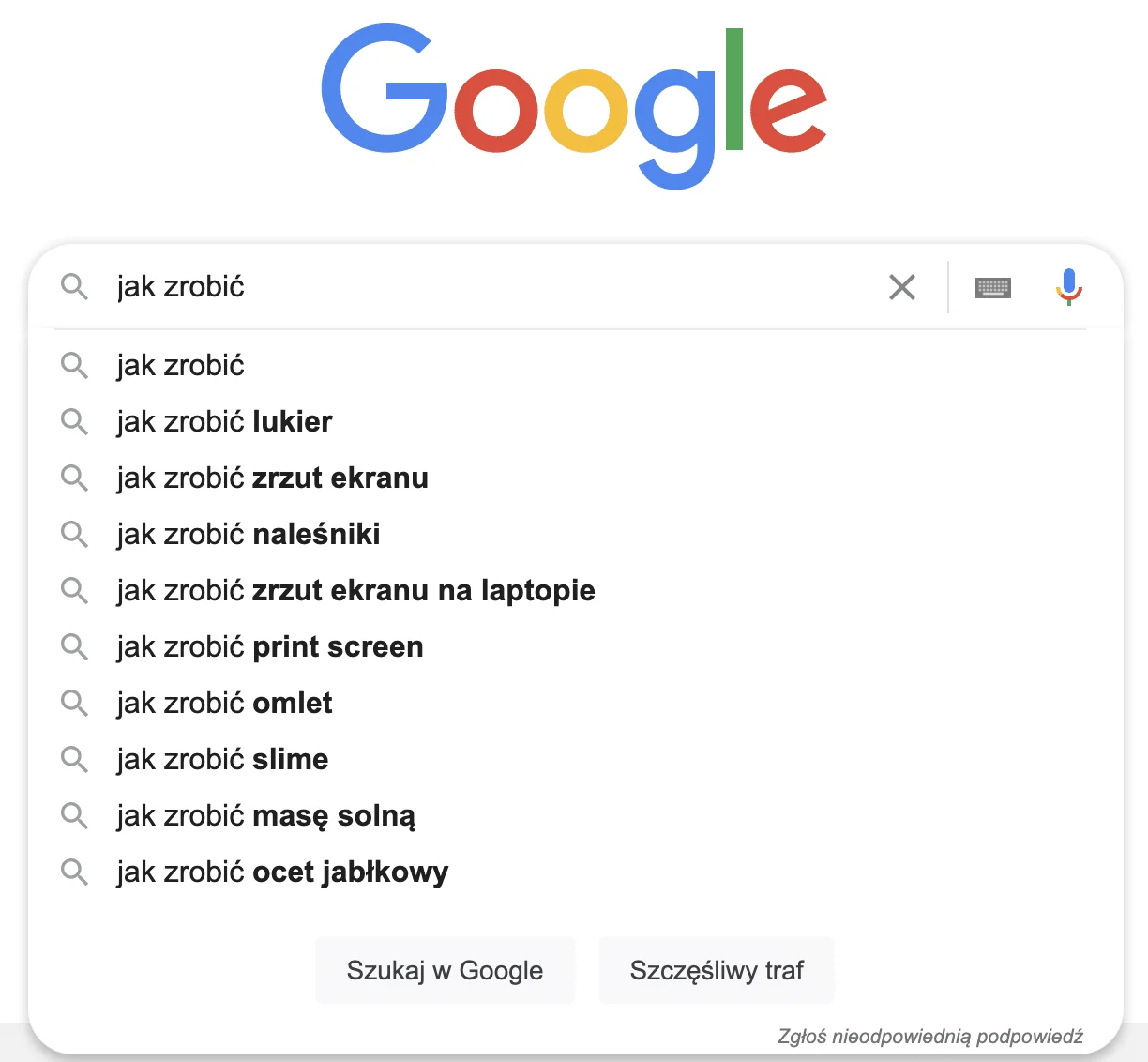 Drugim miejscem, gdzie Google podpowiada frazy, to sama wyszukiwarka, gdzie wpisując frazę Google podpowiada inne warianty.