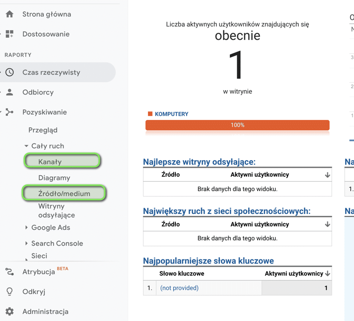 Sprawdzenie ruch, szczególnie ruchu organicznego, za pomocą GA jest bardzo proste. W tym celu wchodzimy do zakładki „Czas rzeczywisty -> Przegląd” i mamy na żywo podgląd tego co się dzieje na stronie www.